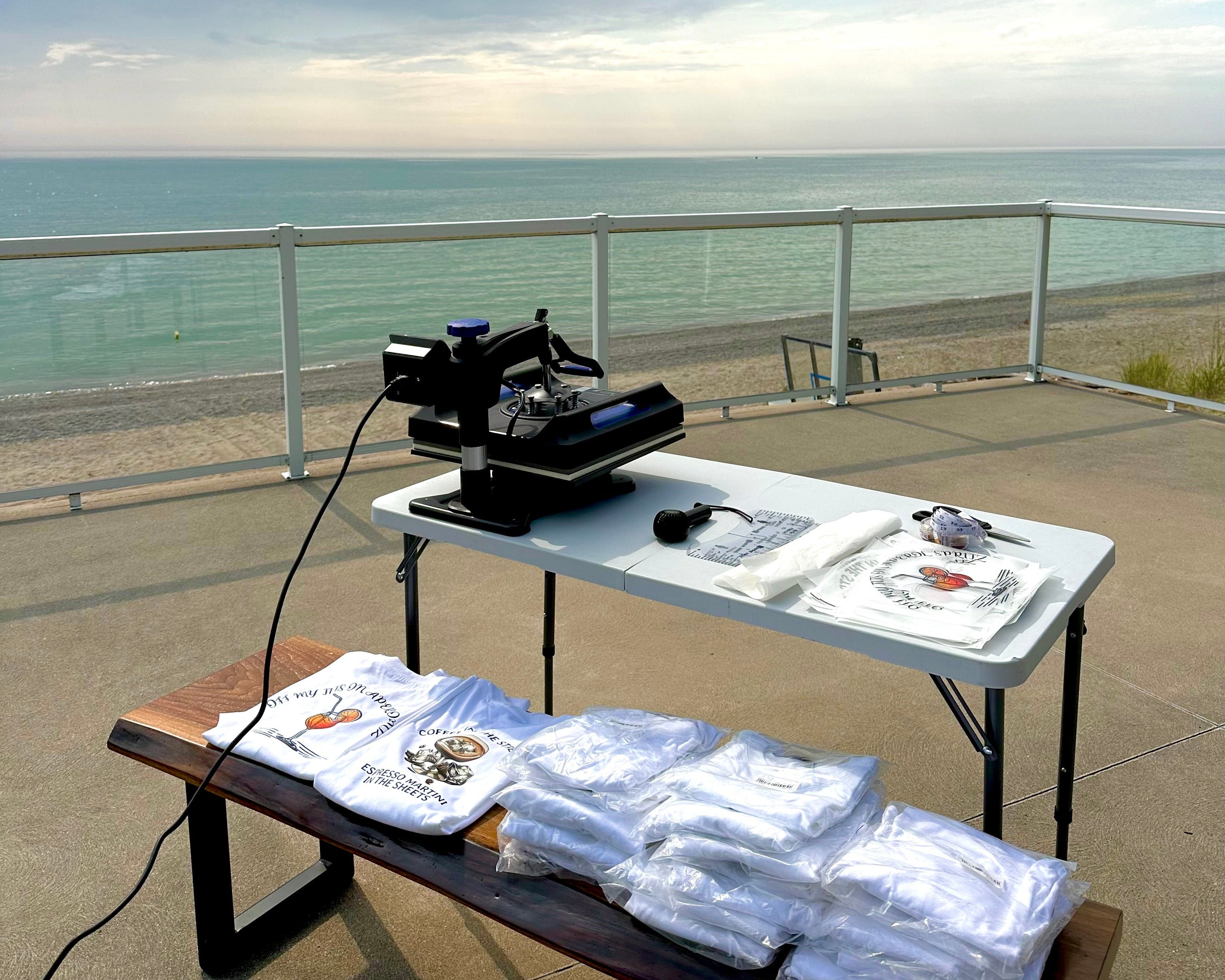 The first two? “Off my tits on Aperol Spritz” and “Coffee in the streets, espresso martini in the sheets.” Why? They made me laugh and I was sick of shopping the same shirts as everyone else. Next thing I know I'm making hundreds with a heat press on my kitchen table.
